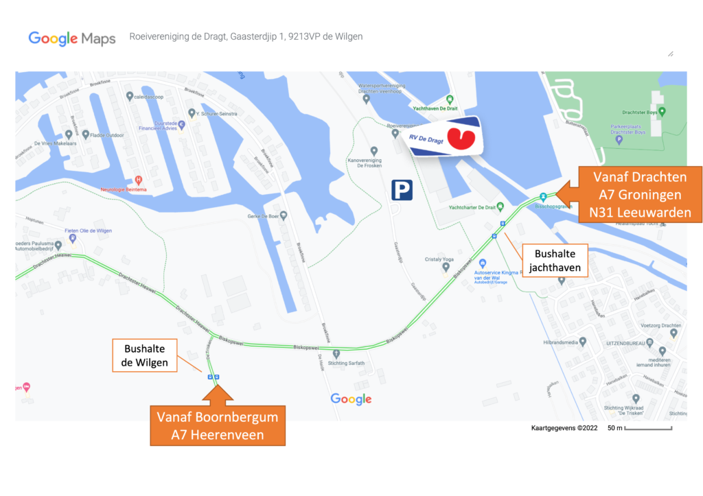 Vlakbij de roeiclub is een bushalte en er is ruim voldoende parkeerplek.